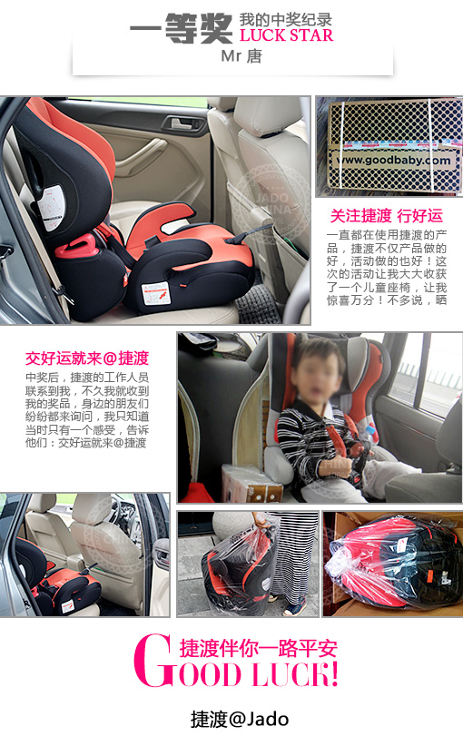 一等獎30名,獎品為價值1500多元的好孩子兒童安全坐椅,孩子是未來,是希望,捷渡與您一同關心您的寶貝,一等獎的客戶拿到獎品后,都十分高興,給我們發來信息說,捷渡想到的太周全,太有愛啦!