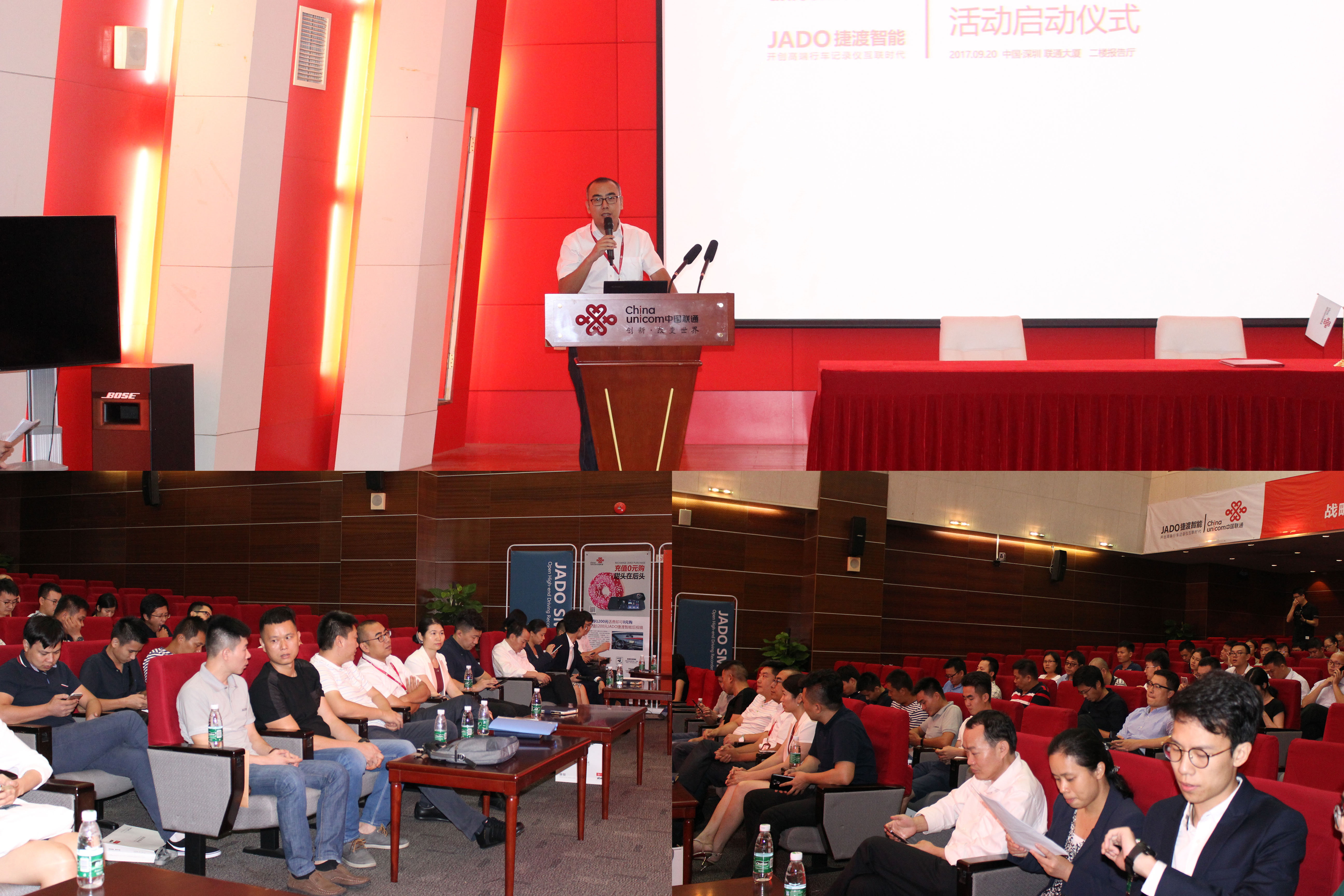 中國聯通(廣東)客戶部總經理麻濤先生上臺致辭,他表示中國聯通有能力在全國范圍內為JADO捷渡智能(中國)提供一站式優質服務。目前中國聯通也在大力發展物聯網項目和技術,與JADO捷渡智能(中國)的合作前景十分廣闊。中國聯通將依托覆蓋全國、通達世界的現代通信網絡,全力支持JADO捷渡智能(中國)在行車記錄儀領域的創新與發展,共同推進建設 “新零售”和“物聯網技術”的應用典范。